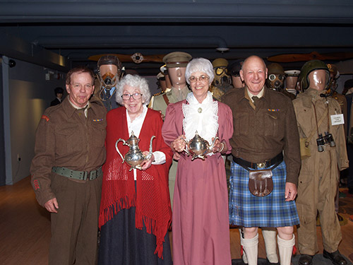 Bunker Military Museum Mother’s Day Tea visitors were whisked back in time to another era Saturday, May 9. Set amid artifacts and memorabilia from war years, with nostalgic piano tunes, guests enjoyed tea and treats made from century-old recipes. Pictured here as servers are, from left: Gary Bigelow, Ann