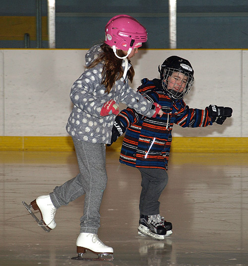 Eight-year-old Avah Miron and Jeremiah Miron, 5, were among a handful of kids at the Haileybury arena on a recent weekday off from school. Free public skating is being offered by the Healthy Kids Community Challenge and Temiskaming Shores on professional development days at local schools. (Staff photo by