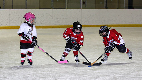 The Haileybury Arena and Recreation Centre was a busy place Saturday when 160 Tyke-level (pre-Novice) hockey players hit the ice to end their season of learning to play hockey. Pictured March 11 are three players moving the puck during one of the games. The players received a participation trophy
