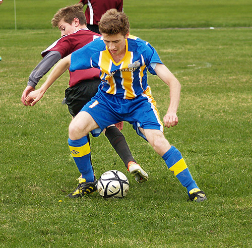 Robbie Mathers of the Timiskaming District Secondary School soccer Saints (right) and his teammates battled with the Blues from Timmins High and Vocational School on home turf May 28. The Saints won the North Eastern Ontario Athletic Association Double-A title in an exciting shootout 2-1. They head to the