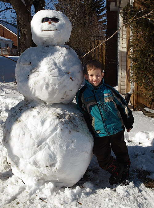 When life gives you lemons – or snow – make the best of it. Eight-year-old Tavis MacArthur, above, and his father Dave took advantage of an overnight snowfall late last week to create an eye-catching snowman in Haileybury. (Staff photo by Diane Johnston)