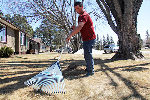 Englehart resident Jessie Harman was taking advantage of the recent warm, sunny weather by doing a little spring cleanup raking leaves at a friend’s place on 9th Avenue last Friday, April 29. (Staff photo by Sue Nielsen)