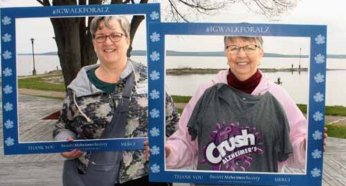 Suzanne Roy’s t-shirt says it all. Roy, at right, travelled from Elk Lake to take part in the Walk for Alzheimer’s, and was thinking of her husband who has the …