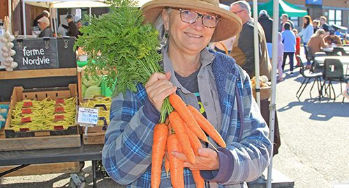 At a recent Riverside Farmer’s Market, Ferme Nordvie owner Sylvie Coté holds a large bunch of fresh, organically grown carrots from her farm located in St. Bruno des Gigues, …