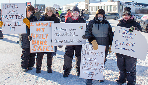 More than 40 people braved frigid weather January 24 to take part in the Temiskaming Shores rally for better road safety. Among those taking part was the organizing committee consisting of, from the left, Tina Nichol, Colleen Carpenter, Kelly Hyde, Terri Vicker-Cote and Jennifer Baker. (Staff photo by Joe O’Grady)