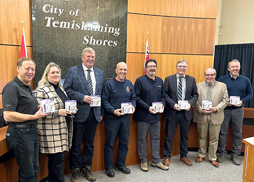 Temiskaming Shores staff and council recently welcomed the donation of 150 combination smoke and carbon monoxide detectors to the community, with the support of Enbridge Gas. Taking part in the presentation were, from left, Councillor Mark Wilson, Chief Administrative Officer Sandra Lee, Councillor Dan Dawson, Fire Chief Steve Langford, Scott Gibson of Enbridge Gas, Mayor Jeff Laferriere, Councillors Danny Whalen and Ian Graydon. (Supplied photo)