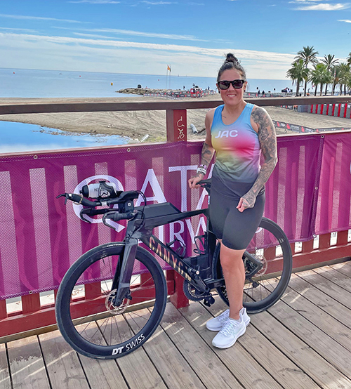 Ironman competitor Josee Courchesne stands next to her bike, which took her on a 56-mile ride during the Marabella, Spain, Ironman event. (Supplied photo)
