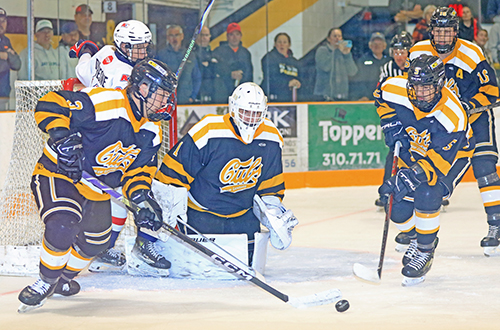 The New Liskeard Cubs dominated play against the U16 North Bay Trappers Friday night at The Shep winning 6-0. A flurry of action took place in front of Cub goalie Morgan Hyndman. He kept his eye on the puck while teammates Liam Major (left) and Morgan Curran (right) and Ethan Roy (behind) helped to clear the zone. (Staff photo by Sue Nielsen)