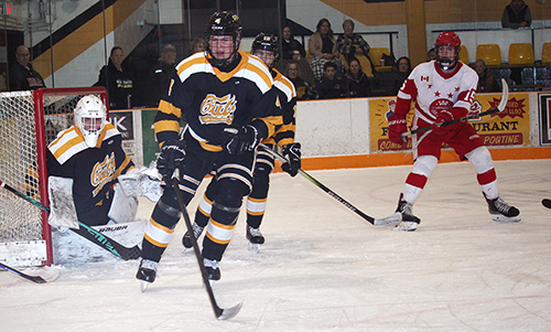 New Liskeard Cubs defenceman Landen Creasey and netminder Morgan Hyndman follow the puck during Great North U18 action at The Shep October 31. The visiting Soo Jr. Greyhounds edged the Cubs 2-1 on a last-minute goal in the second period. (Staff photo by Joe O’Grady)