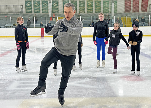 Elvis Stojko demonstrated how to keep your arms forward while skating and to be aware of how your arms are placed while doing routines as skaters in the background listened intently to his comments and watched his moves. (Staff photo by Sue Nielsen)