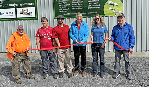 Lead turf crew employee Darcy Hearn, WB Melback representative Don Tracy, Interfor representative Sebastien Bouchard, HGC president Denis Lacroix, Georgia-Pacific representative Tiffany White and lead HGC volunteer Camille Leblanc, from the left, cut the ribbon September 14 to officially open the new equipment building at the HGC. (Staff photo by Sue Nielsen)