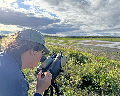 An Evening with Shorebirds presenter, William Konze, looks through a scope, one of several situated during the event for the public to observe shorebirds at the Hilliardton Marsh Research and Education Centre on August 28. (Staff photo by Sue Nielsen)