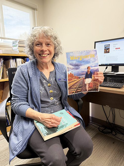 Temiskaming Shores Public Library clerk Carmen Peddie is pictured here showing the next book that will be read and discussed by the library’s French book club. (Staff photo by Darlene Wroe)