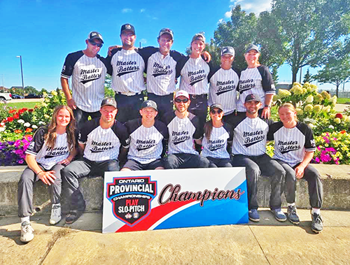 The Master Batters mixed slo-pitch team had success winning the SPN Coed E division Ontario Provincial Championships August 31 in Brampton. From the left in the back row are Dan Ethier, team captain Kyle Breault-O’Brien, Shayne Nosworthy, Kara Breault-O’Brien, Esther Wabie and coach Kara Breault, In the front row are Chantel Duffy, Beej Johnston, Matt Bahm, Danny Regele, Alexie Berthelette, Jared Scott and Chanell Duffy. (Supplied photo)