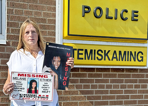 Celine Ethier holds two posters outside the Temiskaming Detachment of the Ontario Provincial Police offices on September 21. She is still searching for answers about her 15-year-old daughter Melanie’s disappearance 29 years ago. (Staff photo by Sue Nielsen)