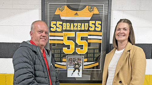 Justin Brazeau’s parents Greg and Heather unveiled their son’s Boston Bruins jersey just before the September 19 Cubs game. Also present for the unveiling of the jersey was Brazeau’s former minor hockey coaches, minor hockey executive members and other family members. (Staff photo by Sue Nielsen)