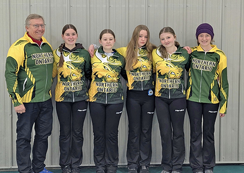 Team Baker, curling out of the Horne Granite Club, is (from the left) coach Steve Amyot, Rya Baker, Jorja Catt, Sydney Catt, Caleigh Holmes and Elizabeth Heaslip. The team will be in Timmins February 8-14 to compete in the U18 Nationals. (Supplied photo)