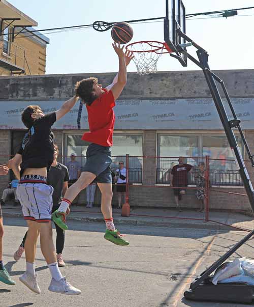Team Bel Air Academy’s Nick Caron gets airborne as he does a layup, with Fast Breakers player Emile Smith trying to block him during the Temiskaming Thunder 3-on-3 Basketball Tournament in downtown New Liskeard on July 26. It was hot weather for street basketball but players kept hydrated during the high-energy event. (Staff photo by Sue Nielsen)